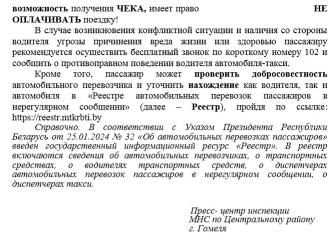 ИМНС РБ по Центральному району г. Гомеля информирует: “Кассовый чек в такси как гарантия защиты прав пассажира” Автор adminВ ИМНСОпубликовано Фев 27, 20250 Комментарии(й)