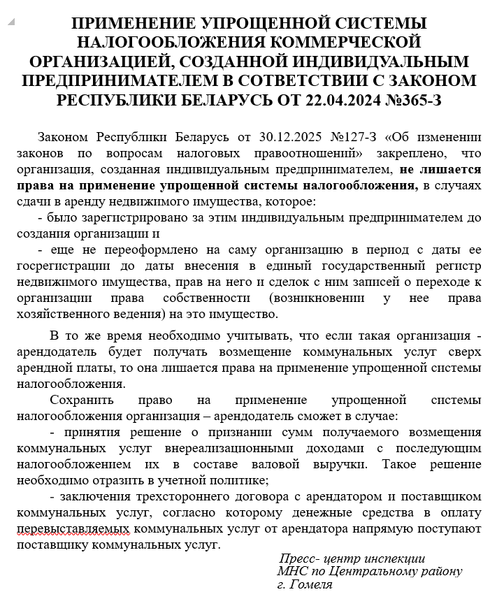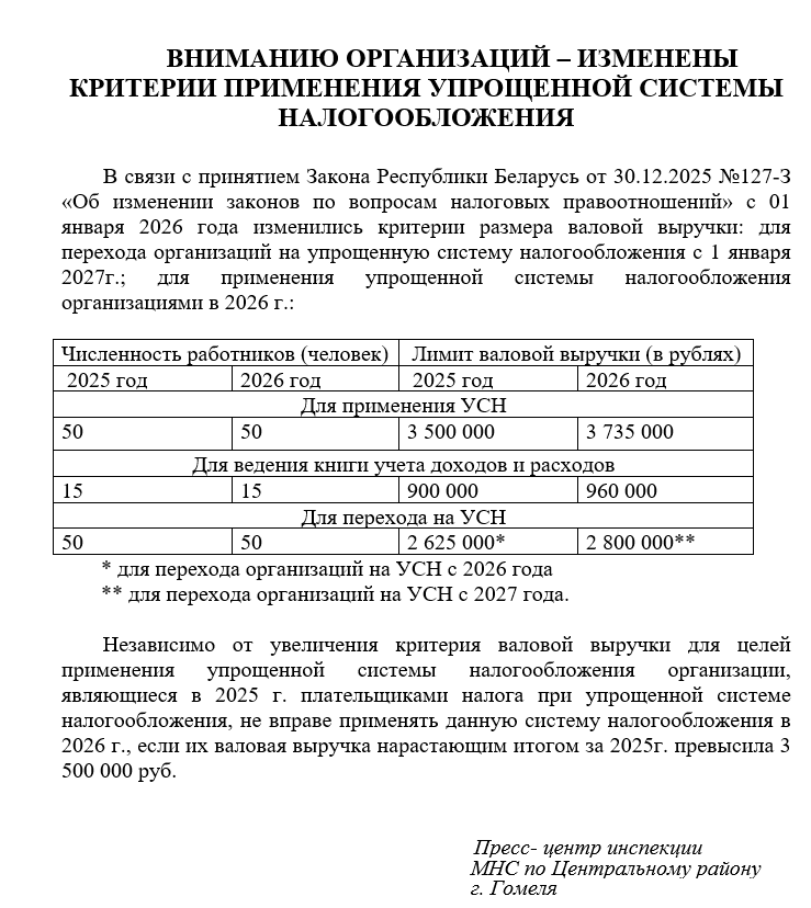 ИМНС РБ по Центральному району г. Гомеля информирует:”Об изменении критериев применения упрощенной системы налогообложения” Автор adminВ ИМНСОпубликовано Янв 14, 20260 Комментарии(й)